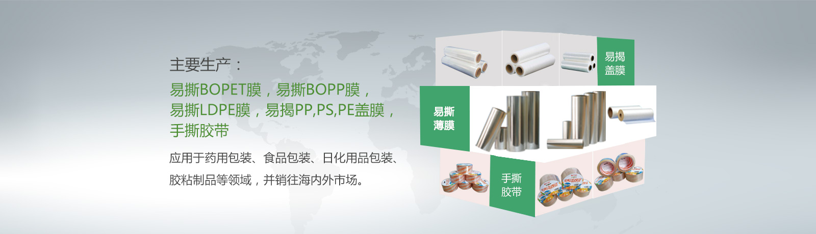 我司主要生產(chǎn)易撕BOPET薄膜、易撕BOPP薄膜,易撕LDPE膜,易揭PP,PS,PE膜,易撕粘性膠帶等新型易撕材料。我司的易撕BOPET,BOPP薄膜經(jīng)反復(fù)測(cè)試實(shí)驗(yàn)確定易撕處理工藝的數(shù)值,做成的各種復(fù)合印刷軟包裝袋可以從一個(gè)方向或位置可徒手撕開(kāi),無(wú)需在袋子的邊緣打缺口或鋸齒狀。它已被廣泛應(yīng)用于藥物、食品、醫(yī)療器械及各種日化用品等軟包裝領(lǐng)域,其可替代玻璃紙,降低生產(chǎn)成本,且能提升產(chǎn)品價(jià)值。